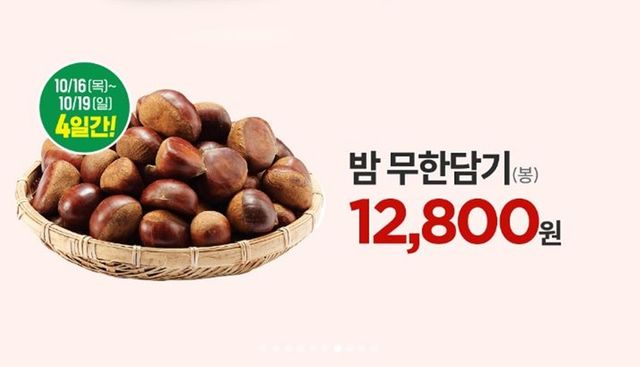 이마트는 10월이 제철인 가을 국민 먹거리(식재료)인 밤을 목요일인 16일부터 일요일인 19일까지 나흘간 직접 한 봉지에 가득 담는 '무한담기' 행사를 진행한다. 이마트 행사 매장에 있는 밤을 개수 제한 없이 마음껏 담을 수 있는 1봉당 가격은 1만 2800원이다.