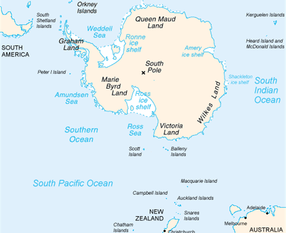 ▲ 남극대륙(Antartica)과 남극해(Southern Ocean) 및 남태평양(South Pacific Ocean), 남인도양(South Indian Ocean), 그리고 남대서양(south atlantic ocean: 지도 윗부분)의 분포도. 왼쪽 위 땅끝은 남미대륙