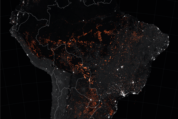 ▲ 2019년 8월 남미 대륙 아마존강 일대의 산불 발생 현황. 미국 항공우주국(NASA)이 인공위성에서 반복적으로 수집한 자료들을 모아 하나의 이미지로 구성했다.