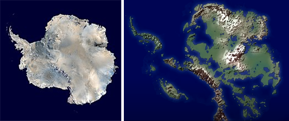 ▲ 얼음으로 뒤덮인 남극대륙과 남극해의 인공위성 합성사진(왼쪽) 및 얼음층 아래의 지각 분포를 조사해 대륙과 바다의 얼음을 벗겨내고 땅덩어리만을 새롭게 그린 지도. 오른쪽 지도에서 오른쪽 윗부분 대륙 본토만해도 호주대륙보다도 넓으며, 섬들을 포함한 육지 면적은 1,40