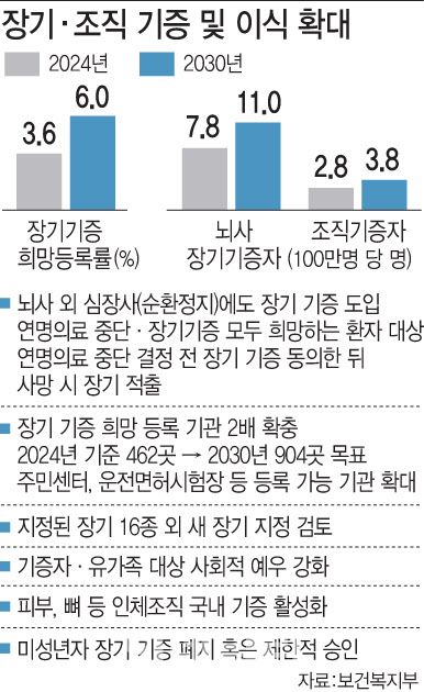 아울러 정부는 장기·조직 기증 활성화를 위해 현재 민간 중심인 장기기증 희망등록과 홍보를 건강보험공단, 신분증 발급기관(주민센터, 도로교통공단 지사 등) 등 공공까지 대폭 확대하고, 인체조직 기증 홍보와 병원 인체조직은행 지원체계를 정비할 계획이다. 이와 함께 고도로 전문적인 장기기증과 이식 분야의 정책결정을 위해 의료계, 학계 전문가, 정부 기관 간의 논의가 활발하게 이루어질 수 있도록 거버넌스를 활성화할 계획이다.