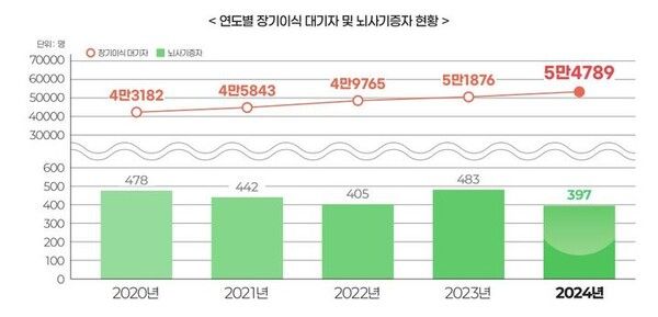 고령화와 의료기술 발달에 따라 장기이식을 기다리는 대기자는 해마다 늘고 있다. 전체 장기이식 대기자는 2020년 4만3182명에서 2024년 5만4789명으로 26.9% 증가했다.