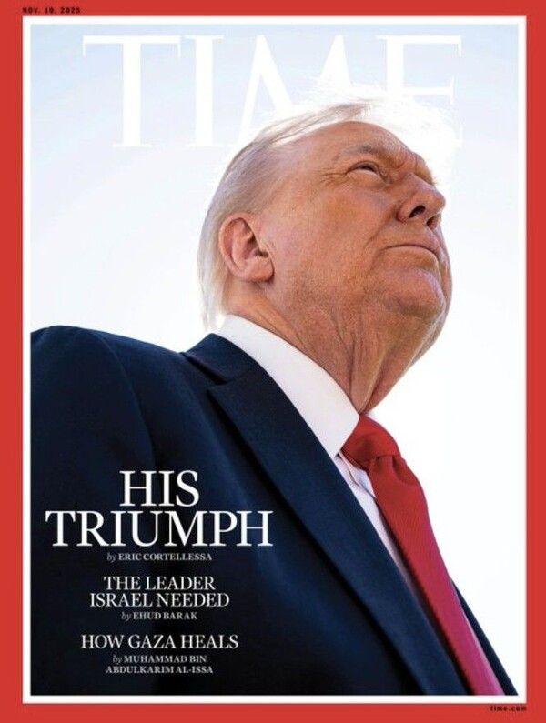 타임이 이날 공식 X에 공개한 표지를 보면, 트럼프 대통령을 아래에서 올려다보며 촬영한 탓에 그의 백발 머리가 햇빛과 겹쳐 거의 보이지 않는다.