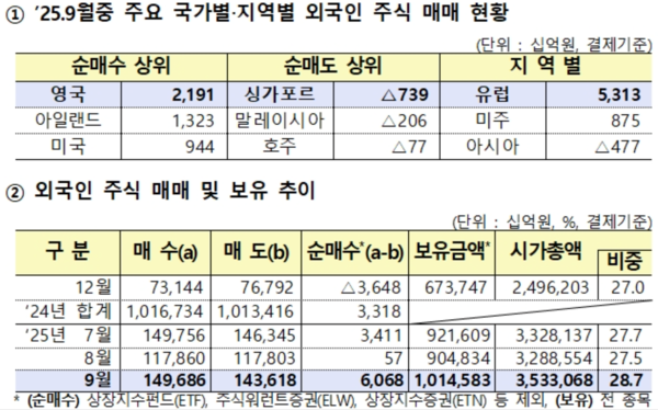 지역별로는 유럽 지역의 매수세가 두드러져 5조 3천억원을 순매수했으며, 미주 지역도 9천억원 순매수를 기록하며 자금 유입을 견인했다. 9월 말 기준 외국인의 국내 주식 보유액은 1,014조 6천억원으로, 시가총액의 28.7%를 차지했다.