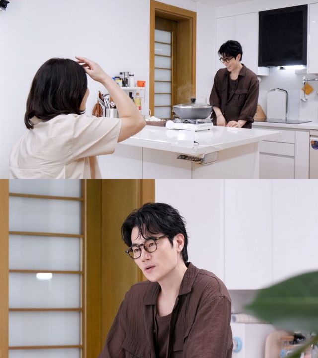 김강우가 요리에 집중하고 있을 때, 김강우의 동갑내기 아내가 깜짝 등장했다. 김강우는 아내를 보자마자 “왜 들어왔어?”라면서도 입꼬리가 자동 승천해 웃음을 줬다. 순정셰프 김강우의 그녀 ‘무영 씨’가 등장한 것. 김강우의 아내는 배우 한혜진의 친언니로, 이렇게 부부가 방송에 동반 출연하는 것은 이번이 처음이다.