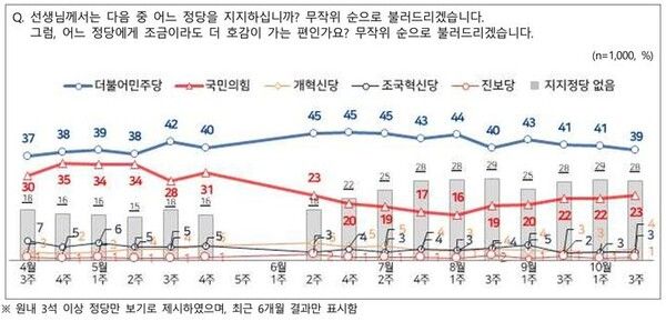 직전 조사(10월 1주차)와 비교해 민주당 지지도는 2%포인트 내렸고 국민의힘 지지도는 1%포인트 올랐다. 같은 기간 지지율 격차는 19%포인트에서 16%포인트로 좁혀졌다.