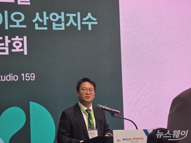 최준호 싸이티바(Cytiva) 아태지역 총괄 사장이 16일 서울 강남 코엑스에서 글로벌 제약·바이오산업 지수 기자간담회를 개최해 발표를 진행하고 있다. 사진=이병현 기자