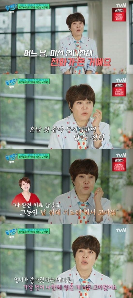 조혜련은 "언니에게 전화가 와서, 혼날 줄 알고 긴장한 채로 받았다"며 "그런데 언니가 '치료가 완전히 끝났고, 그동안 '날 위해 기도해줘서 고마워'라고 하더라"면서 직접 자신의 근황을 알렸던 박미선과의 통화 내용을 전했다.