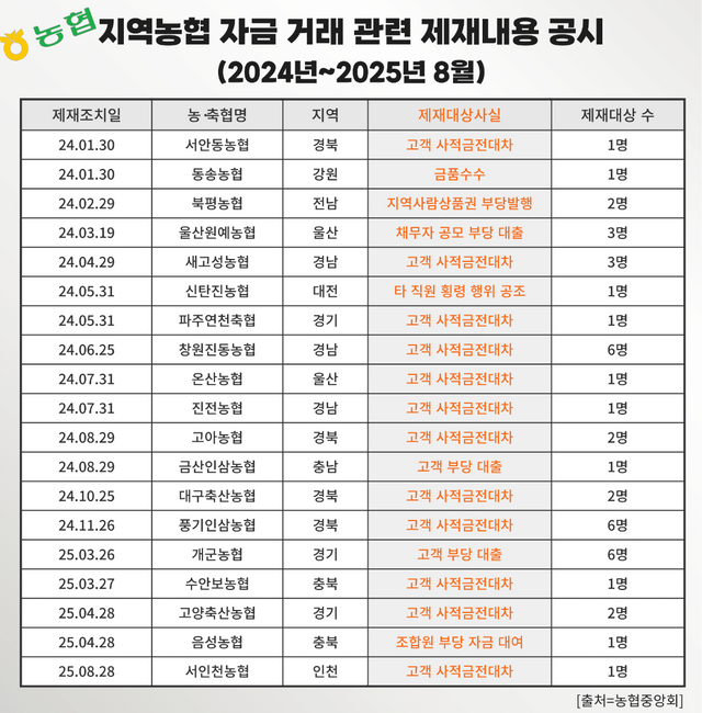 일례로 2024년 1월 30일 강원도 동송농협에서는 직원 1명이 거래처인 법인대표 및 채무자와 사적금전대차 거래를 진행했고 채무자의 연체채권 정상화를 위한 담보 부동산 매매거래 과정에서 매수인으로부터 금품을 수수한 사실이 적발됐다. 2024년 2월 29일에는 전남 북평농협에서 직원 2명이 의뢰인들로부터 상품권 구매 대금을 수취한 뒤 타인 명의로 지역사랑상품권을 대리 발행해 전달한 사실이 밝혀졌다. 지역사랑상품권은 본인이 직접 구매해야 하며 타인 명의로 발행하는 행위는 명의 도용 및 대리발행 제한 위반에 해당한다.