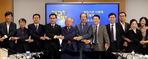 ▲ 박희조 청장(왼쪽 네 번째)이 16일 대전대학교에서 열린 청년 로컬크리에이터 해커톤 업무협약식에서 관계자들과 기념 촬영하고 있다. 동구 제공