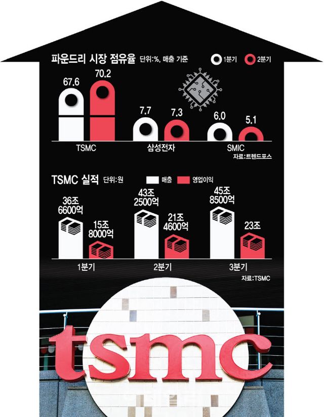 TSMC는 최첨단 공정 기술을 바탕으로 막강한 수익 구조를 갖고 있다. 시장조사업체 트렌드포스에 따르면 TSMC는 2분기 기준 70.7%의 점유율을 차지했다.