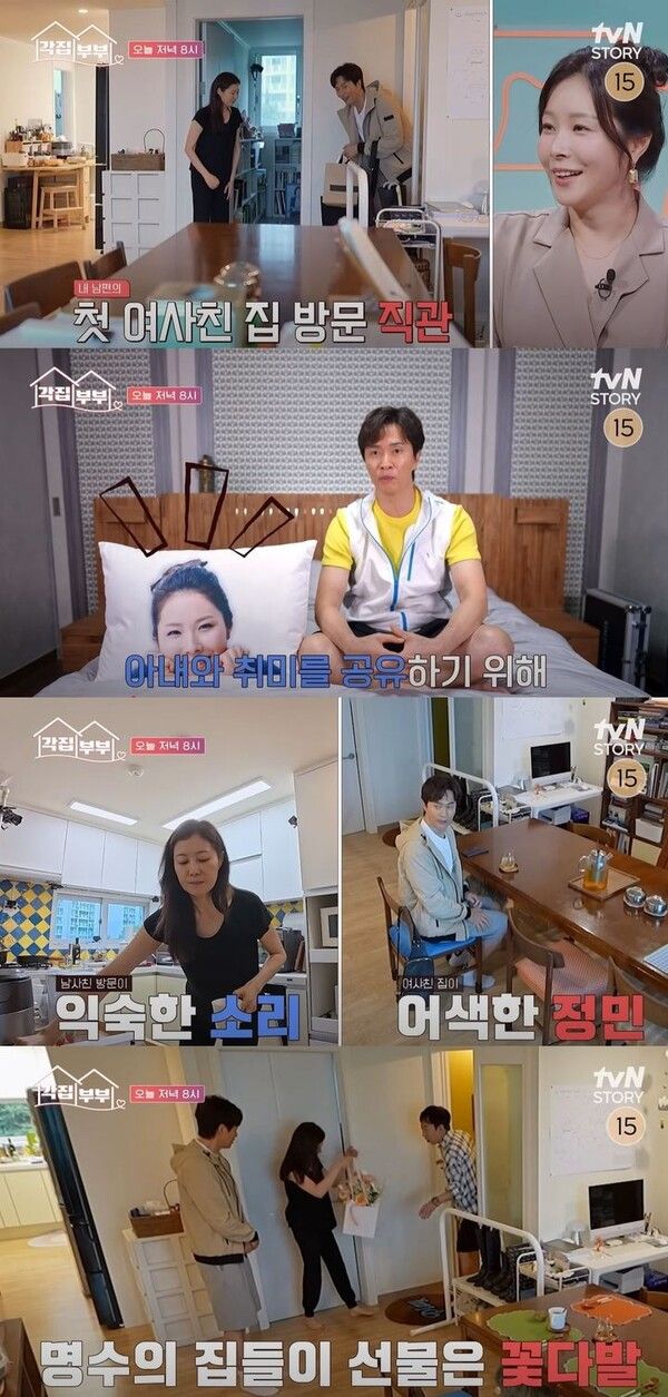 뉴시스 보도에 따르면, 16일 오후 8시 방송하는 tvN 스토리 예능 프로그램 '각집부부'에선 출연진 김정민·박명수가 문소리 집을 찾는다.