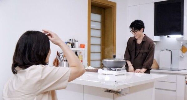 김강우가 요리에 집중하고 있을 때, 그의 동갑내기 아내가 깜짝 등장했다.