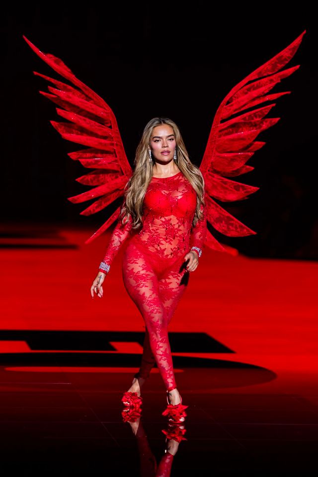 전신을 감싸는 레드 레이스 캣수트와 그에 어울리는 거대한 날개 장식이 만나 강렬한 룩을 완성했다. 그야말로 빨간 맛 무대! 불꽃처럼 뜨거운 에너지에 앙증맞은 하트 포징까지 더해지니 ‘섹시함’의 정의가 카롤 G에 의해 다시 써진 듯하다.