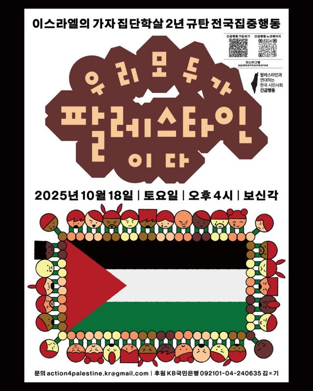 휴전협정이 체결됐다는 소식이 들려온다. 팔레스타인 사람들이 학살로부터 잠시 숨 돌릴 시간이 생겼다. 그러나 인질 석방 하루만에 5명의 팔레스타인이 살해됐다. 전쟁은 아직 끝나지 않았고 투쟁은 계속된다. 오는 18일 보신각에서 "우리 모두가 팔레스타인"이라는 슬로건의 집회가 있다. 거리로 나와 한국 정부의 역할을 촉구하자. 팔레스타인 사람들의 고통이 와 닿지 않는다면, 적어도 한국 국적자가 가자지구로 갈 필요 없을 만큼의 관심을 만들어내자. 관심으로 한국 정부를 움직이고, 그렇게 이스라엘이 집단학살을 멈추게 만들자.