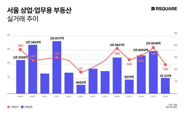 뉴시스 보도에 따르면, 17일 상업용 부동산 종합 서비스 기업 알스퀘어가 발표한 8월 서울 상업·업무용 거래 동향에 따르면, 지난 8월 서울 상업·업무용 부동산 거래규모는 1조 211억 원, 거래건수는 130건으로 집계됐다. 거래 취소 건, 지분 매입 건, 집합 건물 거래 건은 제외한 수치다.