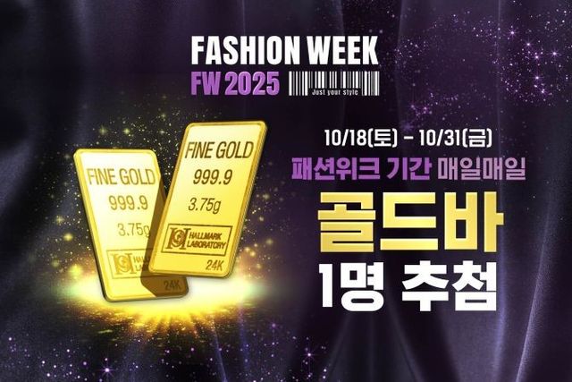 패션위크 기간 내 구매고객 대상 매일 추첨을 통해 '골드바 1돈(14명)'을 증정하는 특별한 혜택도 준비했다. 대상 상품 모바일 구매 시 10% 적립과 일부 상품에 대해서는 최대 10% 카드 청구할인을 제공한다. 행사 기간 매일 모바일 10% 할인쿠폰도 증정한다.