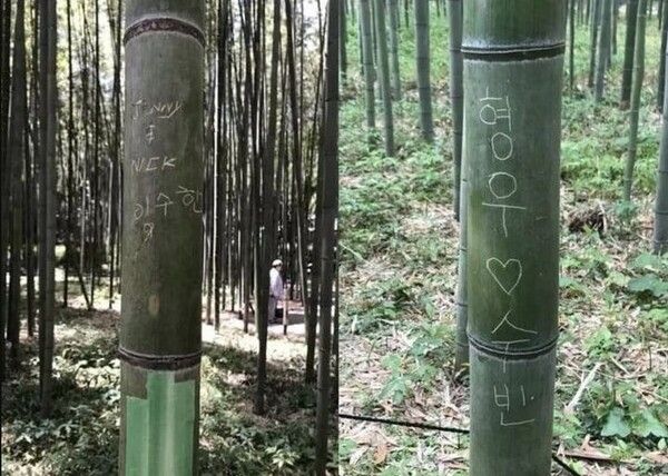뉴시스 보도에 따르면, 15일 아사히신문 등 현지 언론에 따르면 교토시가 지난 6일 아라시야마 일대 약 2.3헥타르(ha) 규모의 대나무숲을 조사한 결과, 전체 약 7000그루 중 350그루에서 칼이나 열쇠 등 날카로운 물체로 새긴 낙서 흔적이 발견됐다.