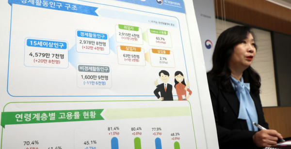 연령계층별로 보면 60세 이상(38만1000명)과 30대(13만3000명)에서는 취업자가 증가했고, 20대(-13만4000명), 40대(-4만5000명), 50대(-1만1000명)에서는 감소했다.