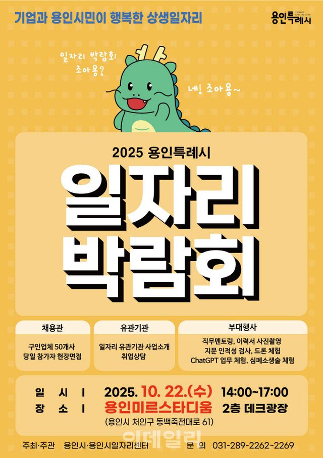 일자리박람회 참여를 희망하는 구직자는 이력서와 자기소개서를 지참해 행사 당일 현장을 방문하면 된다. 자세한 내용은 용인시 일자리센터로 문의하면 안내받을 수 있다.