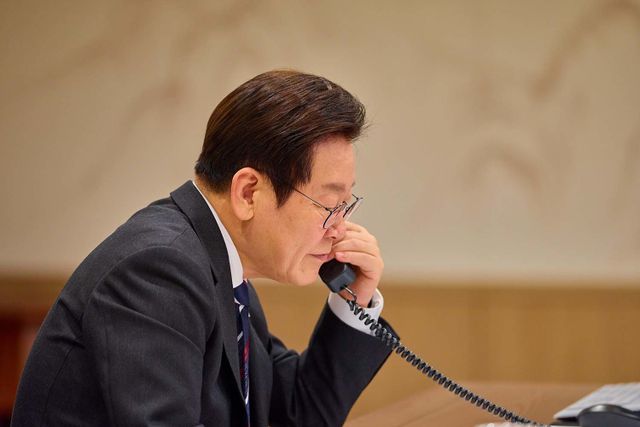 이재명 대통령이 16일 서울 용산 대통령실 청사 집무실에서 아누틴 찬위라꾼 태국 총리와 전화 통화하고 있다. / 대통령실 제공.