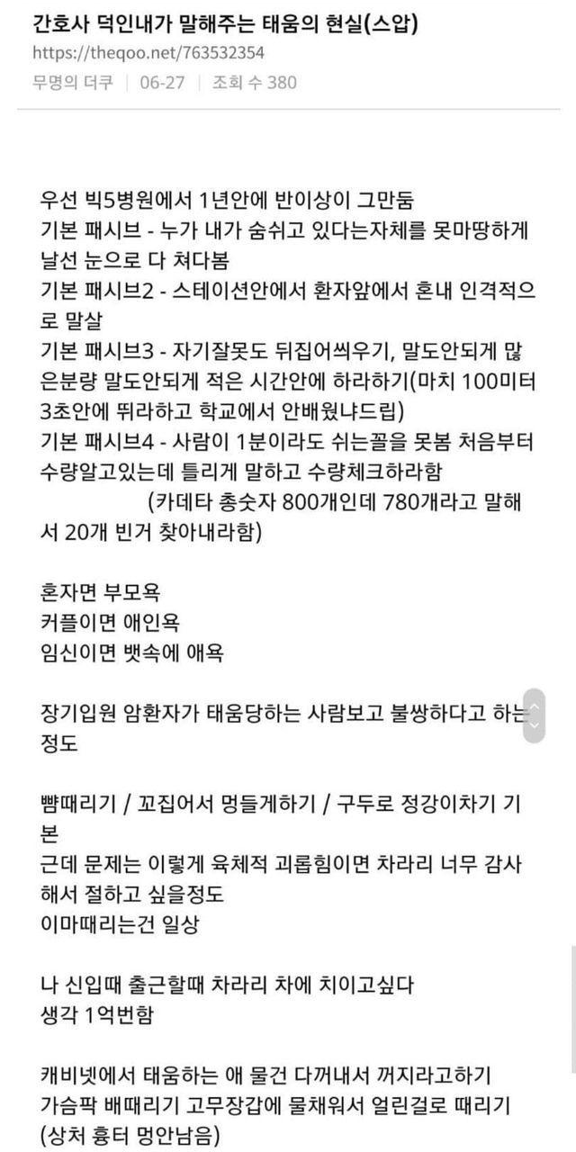 히스테릭 부리는 수간호사의 별의별 욕과 폭행은 기본이고