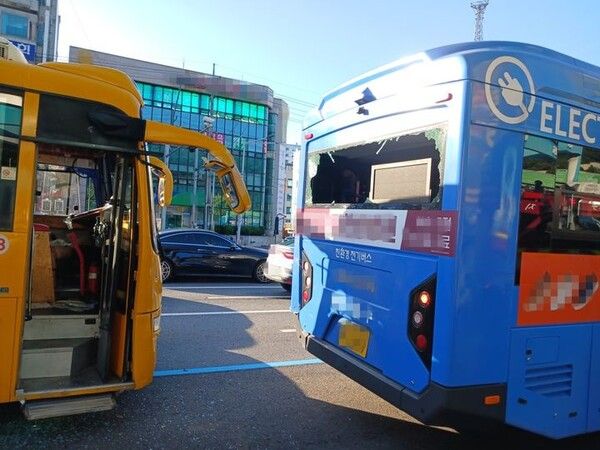 통학버스에는 운전사만 있었으며 시내버스에는 30여명이 탑승해 있었지만 부상을 입지 않은 것으로 파악됐다.