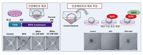 그 결과, 비스페놀 A는 인공배반포의 형성과 체외 착상 과정을 모두 억제하는 것으로 나타났으며 이는 세포 내 활성산소(ROS) 증가로 인한 산화 스트레스가 주요 원인임을 확인했다.
