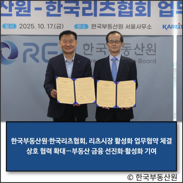 한국부동산원과 한국리츠협회가 17일 서울 중구 한국부동산원 서울사무소에서 '리츠시장 활성화를 위한 업무협약(MOU)'을 체결했다고 밝혔다.