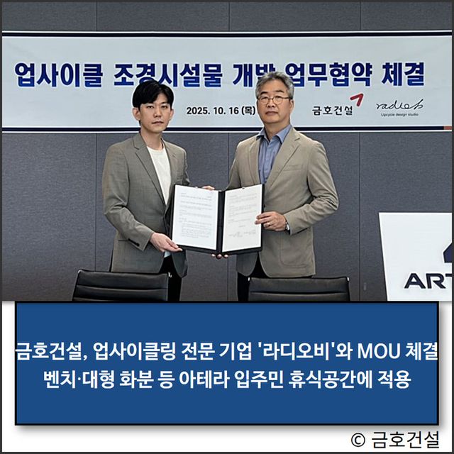 이번 협약을 통해 양사는 건설현장에서 발생하는 폐(廢)자재를 활용해 입주민들을 위한 업사이클링 조경시설물을 개발한다. 이는 버려진 자원에 디자인과조경적 가치를 더해 새로운 시설물로 재탄생시키는 것으로, 개발된 시설물은 금호건설의 조경 특화 브랜드 '아트시스(Artsis)'가 적용되는 아테라 단지에 도입될 예정이다.