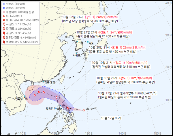 이 토록 발달한 제24호 태풍 ‘펑선(FENGSHEN)’은 내일(19일 필리핀 마닐라 북북서쪽 약 340km 부근 해상을 경유한 뒤 오는 20일 중국 홍콩 남쪽 약 420km 부근 으로 해상으로 이동한다.