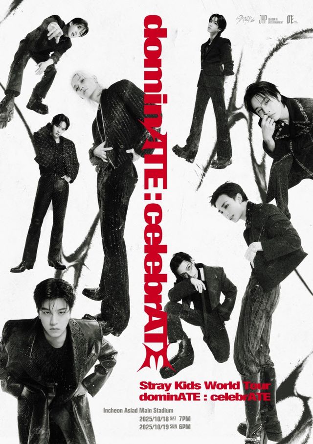스트레이 키즈는 10월 18일~19일 인천아시아드주경기장에서 단독 콘서트 ‘스트레이 키즈 월드 투어 <도미네이트: 셀레브레이트> ’(Stray Kids World Tour < dominATE : celebrATE >)를 개최한다. 이번 콘서트는 지난해 8월 서울 케이스포 돔서 출발해 2025년 7월 로마 스타디오 올림피코에 이르기까지, 전 세계 34개 지역 54회 공연에 빛나는 ‘자체 최대 규모’ 월드투어의 대미를 장식하는 앙코르이자 스트레이 키즈가 데뷔 7년 만에 국내 스타디움에 첫 입성하는 공연으로써 의미를 지닌다.