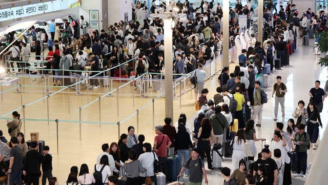 인천국제공항 제1여객터미널에서 여행객들이 탑승 수속을 위해 줄을 서고 있다. / 연합뉴스