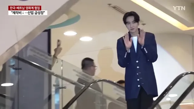 배우 이광수가 에스컬레이터를 타고 내려오자 환호성이 터져 나옵니다.