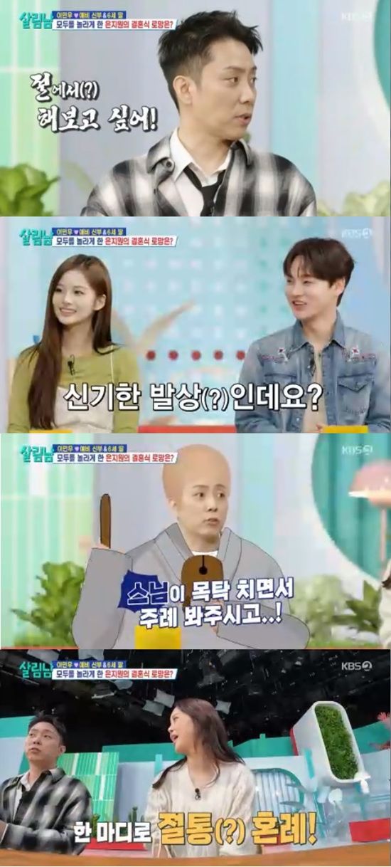 은지원은 "절에서 해보고 싶다는 생각을 했다"고 전통 혼례도 아닌 절 혼례를 얘기해 모두를 놀라게 했다.