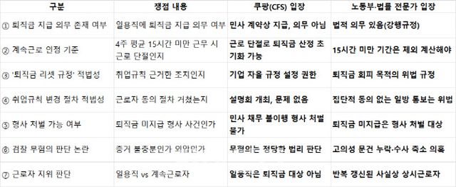 CFS의 퇴직금 리셋 규정 사건은 △일용직 근로자들의 퇴직금 지급 기준을 까다롭게 만든 것이 적법한지 △퇴직금 지급 기준을 변경하면서 근로자들의 동의를 얻었는지 여부가 쟁점이다.