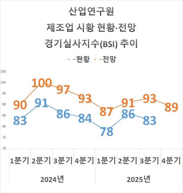 산업연구원이 지난달 1500개 제조기업을 대상으로 시황에 대한 3분기 현황과 4분기 전망을 물은 후 이를 경기실사지수(BSI)로 집계한 현황 BSI는 86에서 83으로, 전망 BSI는 93에서 89로 모두 하락 전환했다고 19일 밝혔다.