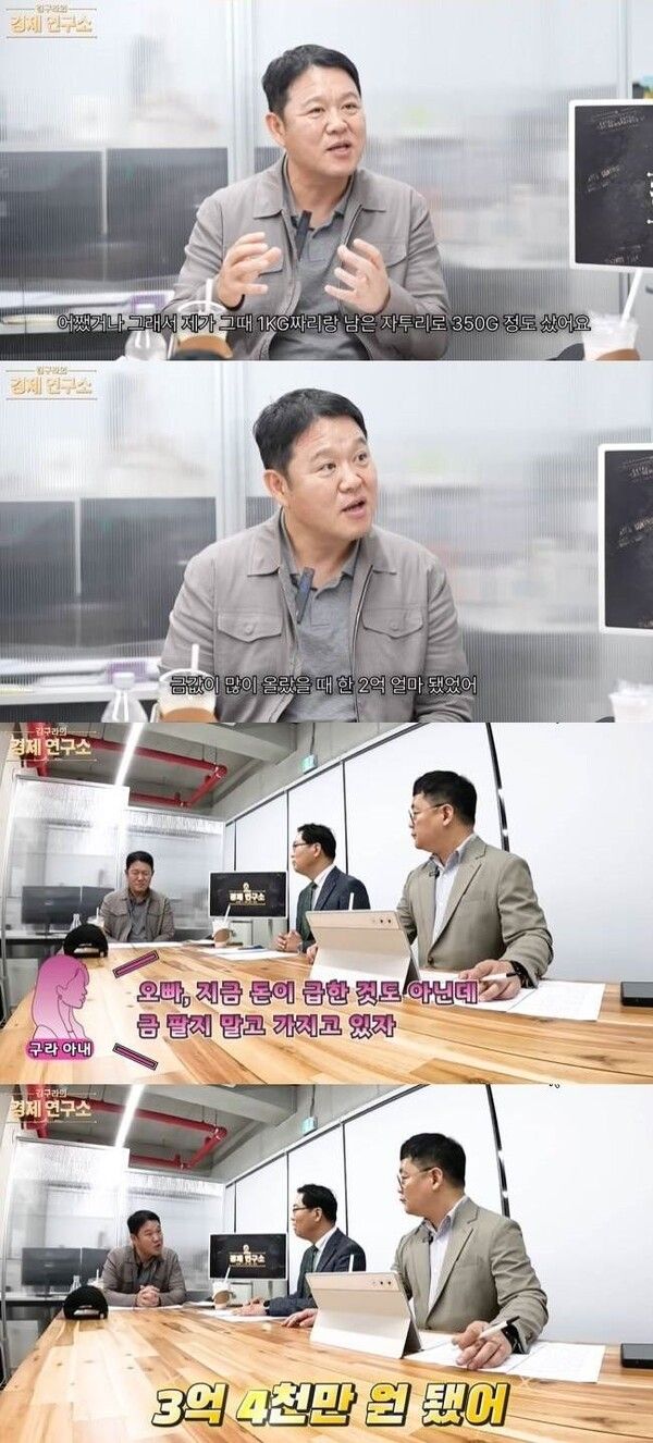 뉴시스 보도에 따르면, 김구라는 18일 유튜브 채널 '그리구라'에서 "예전에 '구라철' 촬영할 때 금 거래소를 갔다. (5년 전) '금이 나름 괜찮다'고 해서 1억원 정도 금을 샀다. 금은 부가세 10%를 미리 내야 해 1억1000만원을 주고 샀다"며 "말이 10%지 당시 금 수익률이 그렇게 좋지 않았다. 몇년간 금으로 10% 먹기가 쉽지 않은 상황이었다. 포트폴리오 재편 차원에서 샀다. 금 거래소에 10㎏짜리가 있었는데, 그걸 샀어야 했다"고 털어놨다.