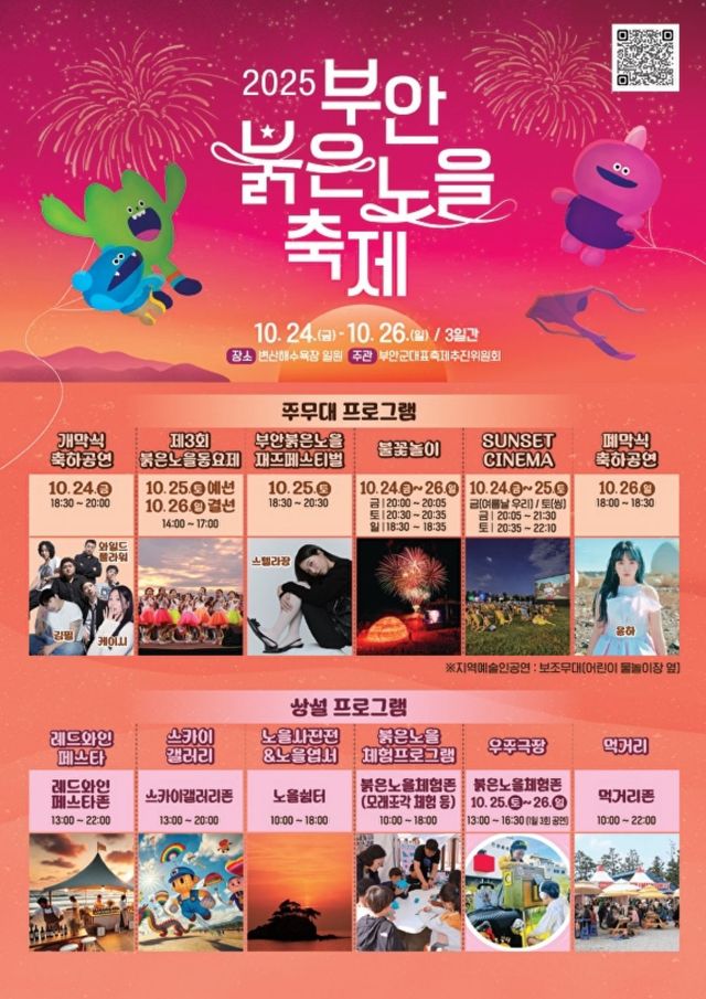 부안군은 2025 부안붉은노을축제가 오는 24일부터 26일까지 사흘간 전북 부안 변산해수욕장에서 열린다고 17일 밝혔다. 붉은 노을을 주제로 한 올해 축제는 레드와인페스타, 부안붉은노을동요제, 붉은노을 재즈페스티벌, 스카이 갤러리 등 다채로운 프로그램으로 꾸며질 예정이다.