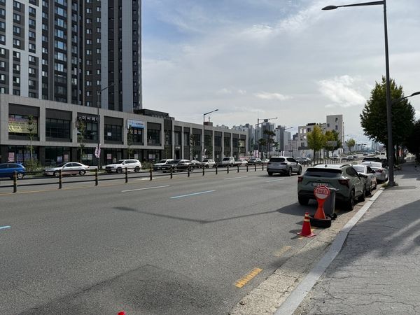 ▲ 주말 갓길에 주차한 차량들이 길게 늘어서 있다. 이주빈 기자.