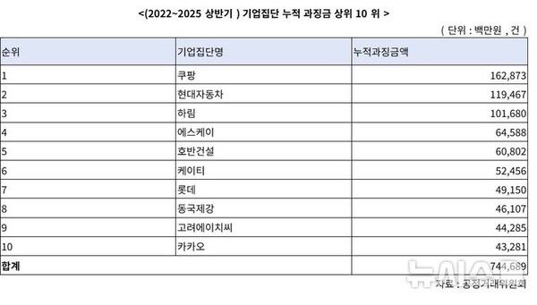 쿠팡에 이어 현대자동차, 하림, SK, 호반건설, KT, 롯데, 동국제강, 고려HC, 카카오가 이름을 올렸다. 이들 기업의 3년 반 동안 누적 과징금액은 7446억원이었다.