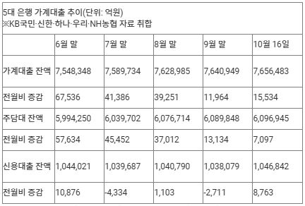 5대 은행(KB국민·신한·하나·우리·NH농협)의 지난 16일 기준 가계대출 잔액은 765조6천483억원으로, 9월 말(764조949억원)보다 1조5천534억원 불었다.