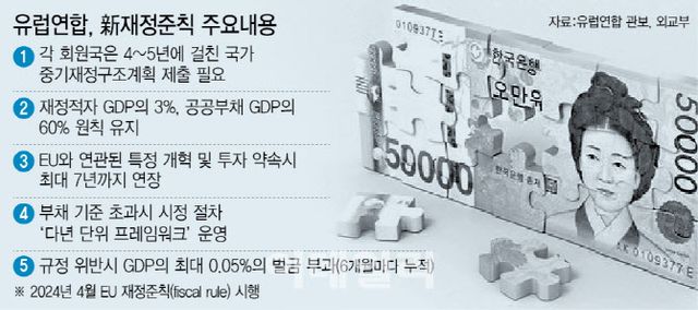 새로운 룰이 적용되면서 EU 모든 회원국은 짧게는 4년, 특정 개혁과 투자를 약속한 경우 최대 7년까지 계획연장을 요청할 수 있도록 했다. 지난 10일 열린 EU 경제재정이사회에선 독일의 경우 국방비 지출 확대를 배제하고, 2031년까지 재정적자 비율 3%를 유지하도록 승인하기도 했다. 단 규정 위반 시엔 GDP의 최대 0.05%의 벌금이 부과된다.