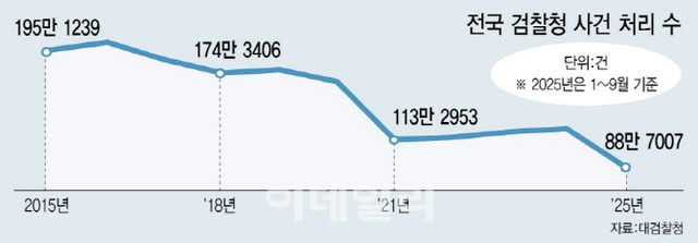 이처럼 민생범죄 처리가 줄줄이 멈춰서고 있는 가운데 올해 전국 검찰청에서 처리되는 사건이 최근 10년 중 최저 수준을 기록할 것이란 우려가 나온다. 검·경 수사권 조정 이후 이미 검찰의 사건처리가 급감해 ‘사건 적체’가 심화했는데 올해는 상당수 검사들이 ‘3대 특검’에 대규모 파견되면서 민생범죄를 처리할 검사 수가 줄어든 게 결정적인 원인으로 꼽힌다.