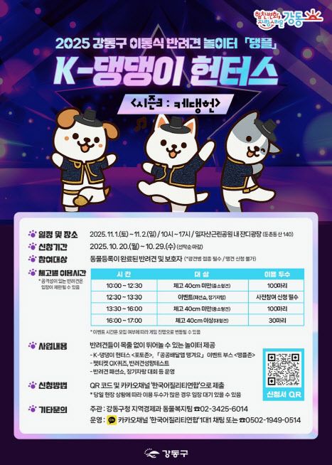참여를 원하는 보호자는 이날 오전 9시부터 강동구 홈페이지에서 ‘댕플’ QR코드나 카카오채널 ‘한국어질리티연합’을 통해 사전 신청할 수 있다. 접수는 선착순으로 마감된다. 자세한 사항은 강동구청 홈페이지를 확인하거나 지역경제과로 문의해 알 수 있다.