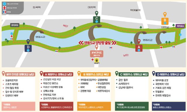 걷기 코스는 영동5교 남단에서 출발해 영동3교와 탄천 합수부 방향 두 경로로 나뉘며, 반환점을 돌아 다시 출발지로 돌아오는 방식이다. 참가자는 코스 곳곳에 설치된 4곳의 건강 체험 부스를 방문하며 6개의 건강 스탬프를 받을 수 있고, 완주자에게는 인센티브를 제공한다.