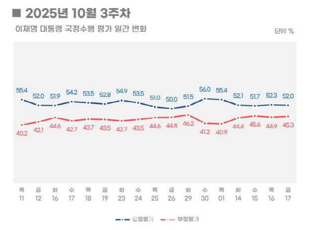 여론조사 전문기관 리얼미터가 에너지경제신문 의뢰로 이달 13일부터 17일까지 닷새간 전국 18세 이상 유권자 2518명을 대상으로 진행한 설문조사 결과, 이 대통령의 지지율은 52.2%로 나타났다. 이는 추석 연휴 전인 10월 1주 차와 비교해 1.3%포인트 하락한 수치다. 반면 부정 평가는 1.6%포인트 상승한 44.9%로 집계됐다. 긍정과 부정 평가 간 격차는 7.3%포인트로 좁혀졌고, ‘잘 모름’ 응답은 3.0%였다.