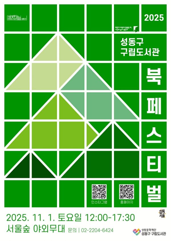 성동구 구립도서관(성동, 금호, 용답, 무지개, 성수, 청계, 매봉산숲속도서관)은 11월 1일(토) 서울숲 야외무대에서 ‘시대정신과 문학’을 주제로 ‘2025 성동구 구립도서관 북 페스티벌’을 개최한다.