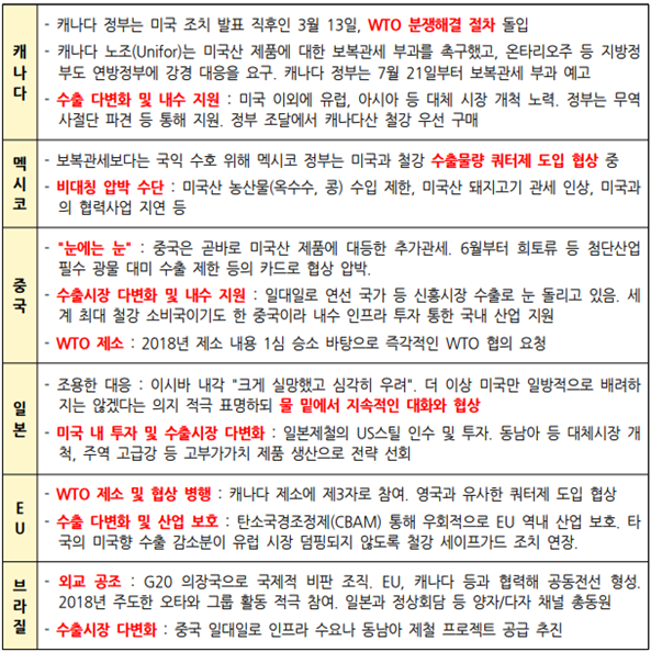 <인사이드경제>는 트럼프 행정부의 철강·알루미늄 관세 관련 세계 각국 정부의 산업정책적 대응을 조사해 보았다. 미국이 가장 처음 관세를 부과했던 북미 동맹국 멕시코·캐나다, 그리고 관세전쟁 끝판왕을 보여준 중국을 비롯해 유럽연합·일본·브라질의 철강·알루미늄 관세 관련 대응정책을 정리해보면 아래 표와 같다.