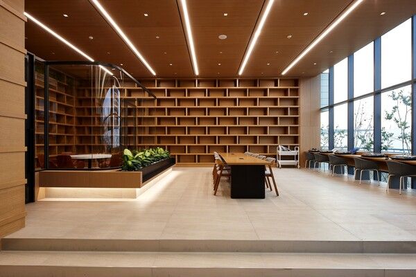 1층 내부 광장은 다양한 방향의 동선 흐름을 만들어 구성원들의 에너지가 자연스럽게 모아지는 중심 공간으로 계획됐다. 2층 ‘빛의 라이브러리’는 통창과 자연 목재의 질감을 살린 설계와 사선 및 곡선을 활용한 공간 디자인으로 창의적 소통과 협업을 이끌어내는 업무 공간이자 휴식 공간으로 설계됐다.